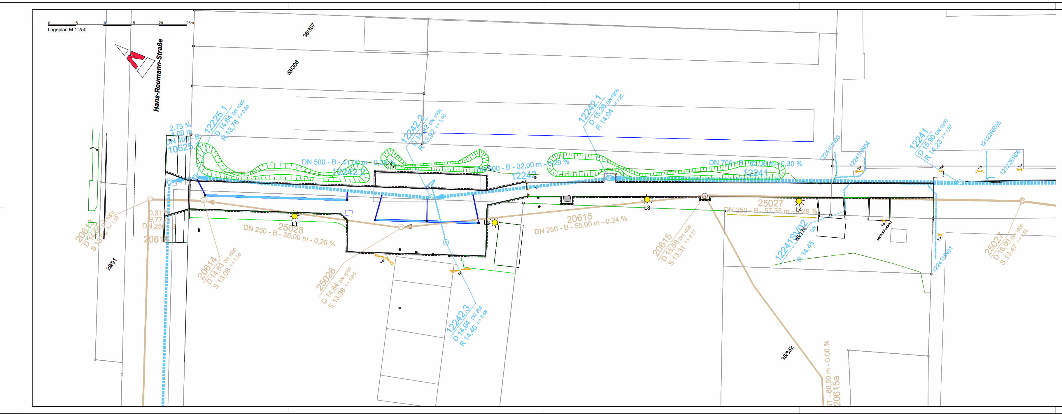 Parallel zur Straßenplanung erfolgt die Neuplanung der Schmutz- und Regenwasserkanäle. Die neuen Kanäle werden im Übergangsbereich von Neubau zu Bestand an das vorhandene Kanalnetz angebunden, bestehende Leitungen werden saniert und hydraulisch angepasst.